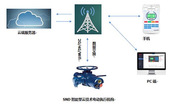 常辅股份SND系列智能云技术电动执行机构,可以通过2G/4G/Wifi等无线网络与云端服务器进行实时交换数据,实现执行机构的远程管理和运行维护,如上图。用户可以通过电脑或者手机的客户端软件访问服务器,操作执行机构的开关运行;查看执行机构的各种状态信息和报警信息,其中状态信息的获取为查询方式,报警信息则采用云端服务器主动推送的方式,自动发到相关人员的微信、短信、手机APP或PC端网页上,保证了信息的实时性;云端服务器也可以记录执行机构的操作数据、状态数据和报警数据,供用户在线查看和下载;用户可以在客户端软件上提交售后申请,实现远程报修,未来还能通过对执行机构长期使用的数据进行分析实现对设备的预维护,实现服务增值。
