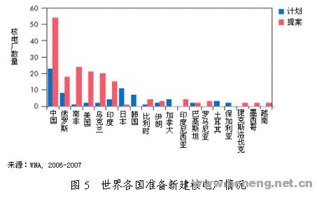 核电是许多国家发展能源的首选。图5为世界各国准备新建核电厂情况,其中"计划"表示已经通过决议,并且资金已经到位的核电厂项目;"提案"表示已经有明确建造意向,但还没有通过决议,未明确资金来源的核电厂项目。