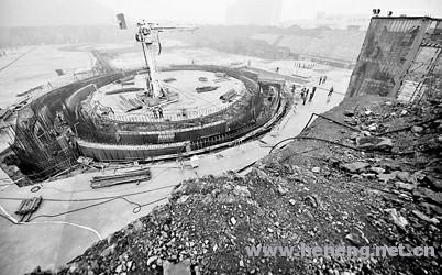 前天,为纪念改革开放30周年,中国核电建设的摇篮——秦山核电站培养出的35名中国第一批核电操纵员汇聚在秦山核电站,追忆过往岁月。图为秦山核电站正在建设的两台百万千瓦核电站工地心脏——核岛。 郭一江