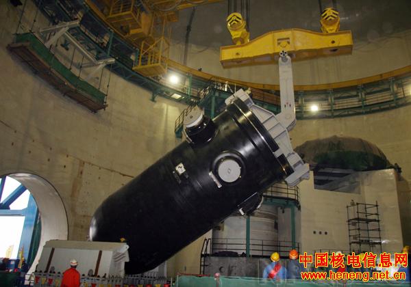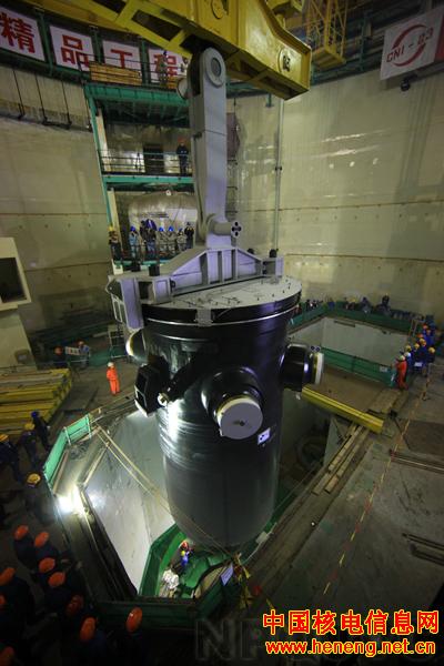 2月16日,春雨绵绵的扩建现场一大早就异常繁忙。3号反应堆厂房20米平台上,施工人员正在紧张地进行“零点坐标”设备入座前最后的准备工作。8点,反应堆压力容器在有序地指挥中开始起吊,经过提升、翻转、竖立等步骤,10点53分,这个庞然大物准确地安插在反应堆堆心。