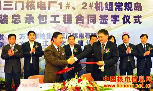 3月15日,中核集团三门核电有限公司在杭州望湖宾馆与浙江省火电建设公司签订了1号、2号机组常规岛建筑安装总承包工程合同。国家电力监管委员会华东监管局杭州监管办公室党组书记、专员谢国兴,浙江省电力公司副总经理石华军,省能源集团有限公司副总经理柯吉欣,三门核电有限公司总经理、党委书记顾军,以及浙江省火电建设公司经理赵刚、党委书记沈妙言等领导参加了签字仪式。