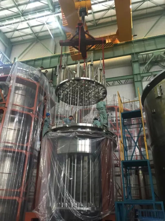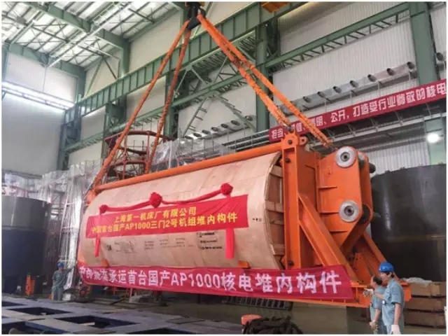 下部堆内构件车间起吊 2015年6月13日,由上海第一机床厂有限公司承制的首台国产AP1000核电站堆内构件——三门2号机组堆内构件在顺利完成制造和验收后发运。这意味着AP1000依托项目4台机组的核岛关键设备国产化计划任务全部完成。