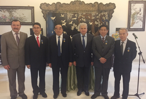 9月28日,在俄罗斯核工业建立70周年暨俄罗斯国家“核工作者日”这个特殊的日子里,俄罗斯政府驻华全权大使杰尼索夫在北京为中核集团董事长孙勤、原核工业部副部长陈肇博、中国核能电力股份有限公司副总经理吴秀江、中核集团江苏核电有限公司原总工程师马一等4人颁发了“核领域国际合作”荣誉勋章。该勋章是俄罗斯政府为表彰在核领域国际合作方面做出特殊贡献的人员而设立的。