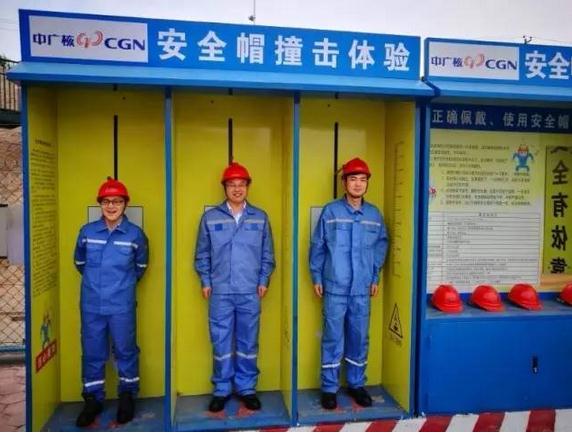 换上没有金属配饰的工作服、穿上防砸鞋、戴上安全帽,而后记者被带到核电施工现场入口处。这里有一系列用于安全培训的设备,戴上安全帽,记者首先进行安全帽撞击体验。