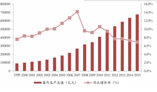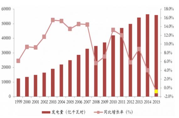 电力增长与 GDP 增长相关性极大,发展趋势基本吻合。改革开放以来,我国经济保持较快增长,取得巨大成就。与此同时,电力作为经济增长的重要投入品,消费增速与经济增长保持同步。按统计数据计算,1999~2015 年我国经济增长了 7.5 倍,年均增长 9.4%;全社会发电量增长了 4.5 倍,年均增长 9.8%;相关系数约为 1.04。2012 年进入新常态经济以后,经济平均年增长 7.4%,发电量平均增长 4.5%,相关系数约为 0.6。