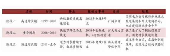 第一阶段是在 1999~2007 年,电改 5 号文成为主要的驱动事件,国家电力公司拆分成五大发电集团和两大电网公司,发电集团跑马圈地,大批的电源项目上马,从2002~2007 年的火电投资潮为火电的发展奠定基础。