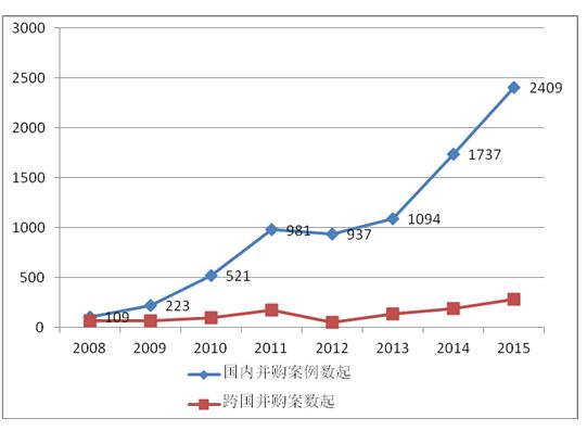 2008~2015年中国企业国内并购和跨国并购案例数量一览