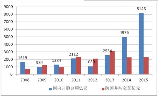 2008~2015年中国企业国内并购和跨国并购交易金额一览