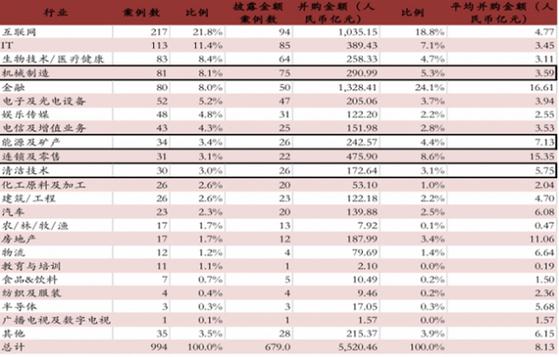 2015年共完成并购案例数2,692起,较 2014 年的 1,929 起大增 39.6%;披露金额的并购案例总计 2,317 起,涉及交易金额共 1.04万亿元,同比增长 44.0%,平均并购金额为 3.88 亿元。2015 年 8 月,四部委发布《关于鼓励上市公司兼并重组、现金分红及回购股份的通知》,进一步简政放权,大大优化了并购市场环境。2015 年政策继续鼓励深化国企改革,地方政府加强混改布局,大大增加了国资背景企业并购活跃度。多个行业并购遍地开花,互联网、IT 等产业强强合并不断涌现,中石化、万达等大型企业也在跨国并购中完善自身产业链。