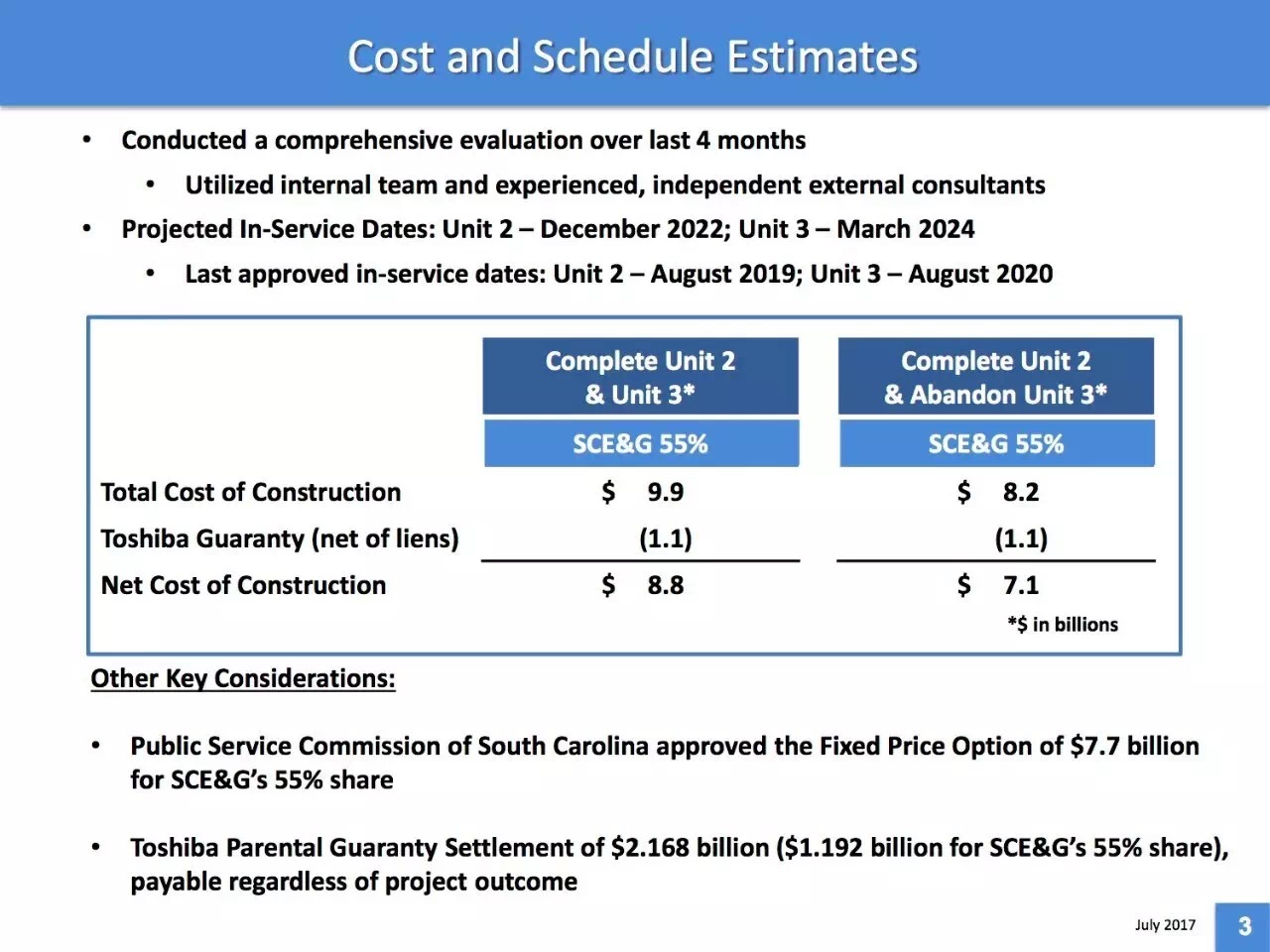 SCANA公司主席兼CEO Kevin Marsh在当地时间31日下午四点召开的投资者电话会议中介绍,目前V.C Summer两台机组预计投运时间分别为2022年12月和2024年3月。两台机组完工的总成本预计为180亿美元,其中SCANA将担负约99亿美元。若计入东芝的21.68亿美元赔偿,总成本约为160亿美元,SCANA将承担约88亿美元。