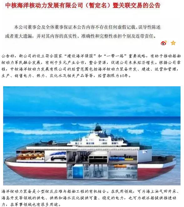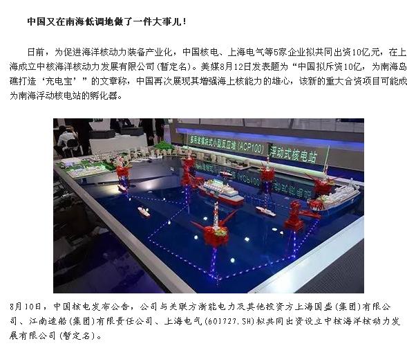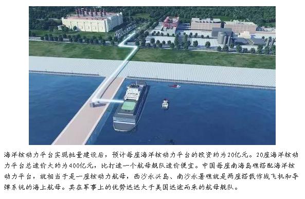 中核集团官方微信2016年7月14日曾发表一篇题为“深度能源观察:我国将在南海岛礁建造20座海上核电站”的文章,文章称,随着中国海上民用核动力技术成熟,中国正在全力建造海上核动力平台及破冰船。中船重工未来将批量建造近20座海洋核动力平台。