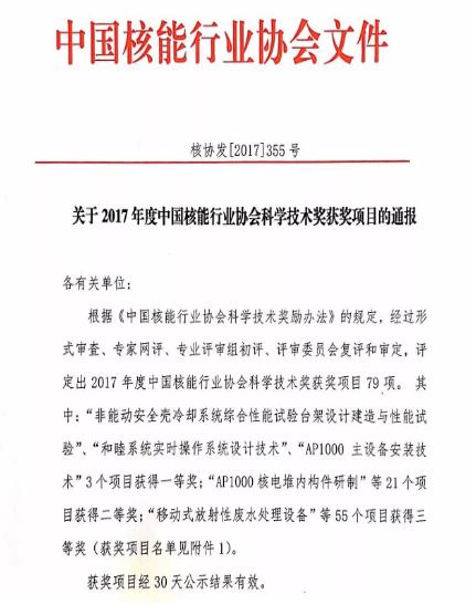 “和睦系统”荣获2017年度中国核能行业协会科学技术奖一等奖