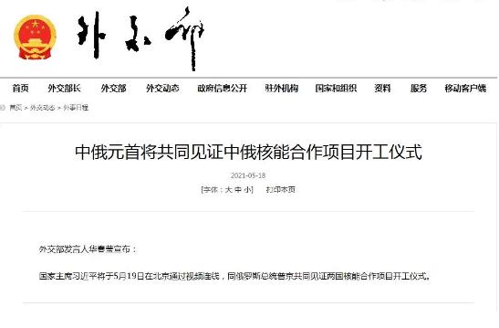 外交部发言人华春莹5月18日宣布:国家主席习近平将于5月19日在北京通过视频连线,同俄罗斯总统普京共同见证两国核能合作项目开工仪式。