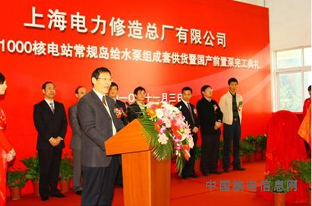 2010年11月3日,首台常规岛给水泵组成套供货暨国产前置泵完工典礼在上海举行,来自环保部上海核与辐射安全监督站、山东核电有限公司、中国通用机械工业协会、上海市核电办公室、上海电力公司、中国电能成套设备有限公司、国核工程公司、广东电力设计院、上海电力修造总厂有限公司等单位的领导和专家出席了庆典仪式,公司副总经理王平代表业主公司致辞。