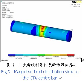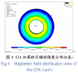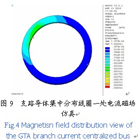 从云图3中看到在GTA铁芯圆周方向上磁场强度相等,分析是由于铁芯直径尺寸较大,磁场强度绝对数值量较小且分布均匀,径向变化量很小。为更清楚地观察铁芯中磁场分布情况,在加厚GTA铁芯尺寸修改仿真模型基础上,再做仿真计算分析,如图4所示,在铁芯径向平面上,由中心向外,磁场强度逐渐减小。铁芯圆周的每个断面上通过磁感应强度基本一致。仿真同时发现一次母线铜导体磁场强度也不是均匀分布,在轴向方向上,中间铁芯环绕处磁场强度最强,由电流的趋肤效应,在径方向上,一次母线铜导体表面场强最强。如图5。 所以在采用并联式等安匝进行误差校验时,对并联一次组合导体处理方式上时要加以考虑。