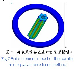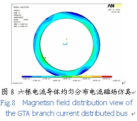 同时对这种并联式等安匝法中,并联导体没有集中绑扎成一股而是均匀分布于铁芯园周上的情况进行磁场强度分布仿真如图8。
