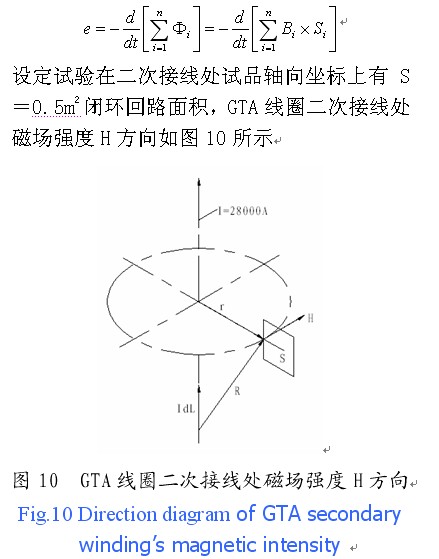 现场试验所临时搭建的误差测试系统与标准试验室系统相比存在较多的不确定性因素,除去电源容量因素外,由二次引线所带来的不确定性因素最大。从现场GTA误差校验试验图二中看到二次测量回路特别是测差回路部分不同与标准试验室相对固定,线路多暴露放置在地面(标准试验室二次回路多用屏蔽管从地下穿过)。设备、电源位置不能固定,难以保证测量引线避开工频电源线、一次大电流引线的干扰。所以现场试验时,需合理进行布局,在二次回路引线的长度与走向上,尽可能避开有强磁场区间,在不可避免情况时,尽可能减小漏磁通在二次回路特别是二次测差回路上的作用面积,减小对误差测量影响。根据电磁感应定律[13];