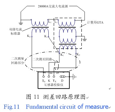 试品GTA电流比28000A/1A由两级组成,第一级电流互感器(28000A/20A),第二级电流互感器(20A/1A),二次负荷分别为20VA、5VA和1VA。根据用户要求分别对两级组合的28000A/1A、20A/1A电流比进行校验。