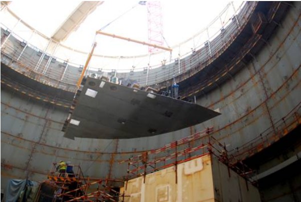 2012年4月28日,三门项目一号核岛反应堆厂房135尺最后一块楼板模块CA55吊装就位。