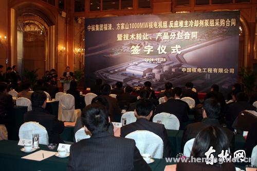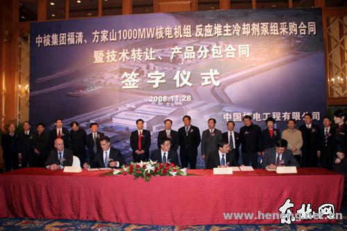 东北网11月28日讯(记者 高长利) 28日,中核集团福清、方家山1000MW核电机组反应堆主冷却剂泵组采购合同暨技术转让、产品分包合同签字仪式在哈尔滨举行。国家发改委副主任、国家能源局局长张国宝,省长栗战书,副省长盖如垠出席签字仪式。