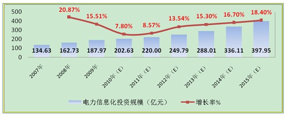 图表 1:2007-2015年我国电力信息化投资规模及增长率图
