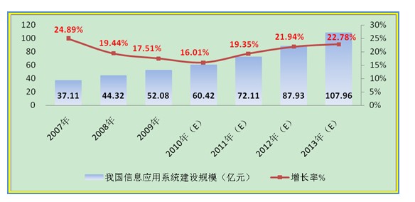 电力行业的信息应用系统建设是针对电力企业的各种管理需求,进行应用软件系统开发,以及各软件系统之间的界面、数据和流程集成的应用系统集成。从信息应用系统建设市场需求来看,2009年,我国电力信息化建设规模为187.97亿元,其中信息应用系统建设占据27.7%。随着电力行业的信息化需求由生产经营操作层向业务管理层和决策层转变影响,近年来信息应用系统建设领域在电力信息化行业的投资比例逐年增加,其市场需求高于电力信息化行业增长。