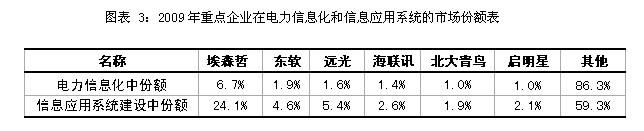 2009年,6家企业在电力信息化行业市场占有率基本在1%-2%左右,仅埃森哲的市场占有率高达6.7%,重点企业合计占15..94%的市场份额,其余的市场份额则被数量众多的其他中小企业分割,可见电力信息化行业并未形成具绝对领导地位的龙头企业。而在信息应用系统建设中,6家重点企业合计占电力行业信息应用系统建设市场份额的40.7%,市场相对于电力信息化行业要集中很多,各重点企业在各自领域也各有优势,如埃森哲专注于于ERP套装软件、东软专注于财务软件、海联讯则专注于信息门户解决方案、数据中心解决方案和工程管理系统等。