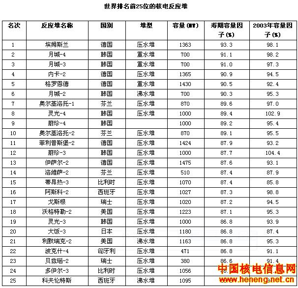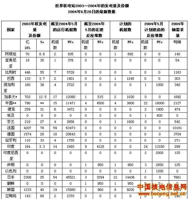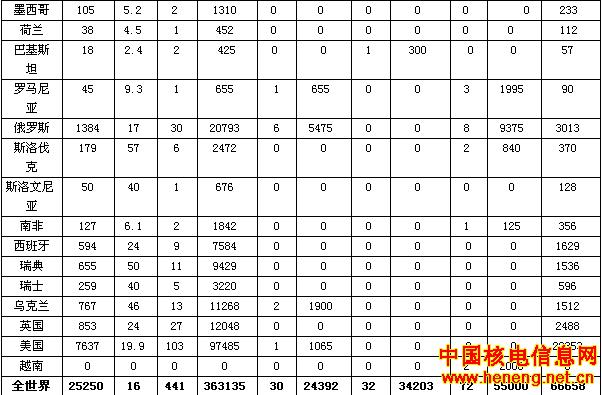 中国:中国运行机组总容量包括大陆9座反应堆(总容量为6587MWe,核发电总量为416亿千瓦时)和台湾省6座反应堆(总容量为4884Mwe,核发电总量为374亿千瓦时),其核发电量分别占各自总发电量的2.2%和22%。在建反应堆含大陆的两座(1900Mwe)和台湾省的两座(2600Mwe)。大陆计划再建4座总容量达3800MWe的反应堆。中国的铀需求量含大陆的1172吨和台湾的955吨。