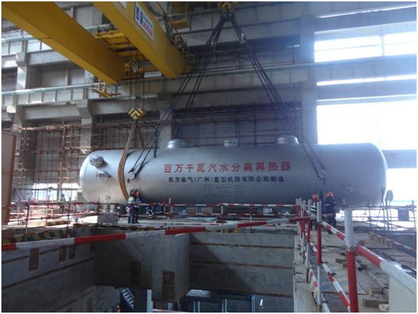 2014年03月14日09时50分,福清核电3#常规岛A列汽水分离再热器(MSR)平稳、精准落位于球型支座上,这标志着福清核电3#机组两台MSR已全部成功吊装就位。 MSR全称汽水分离再热器,由国内东方电气东方重机厂制造,为福清核电3#常规岛关键设备。核电常规岛每台机组布置两台MSR,目的在于提高汽轮机的效率,并减少对低压缸长叶片的刷蚀。MSR净重约255t,尺寸长22.25m,直径4.3m,面对这一庞然大物,项目部施工管理一部、采仓部、施工支持部充分重视、紧力配合,于2014年03月13日顺利卸船短倒至常规岛厂房。 MSR的顺利成功吊装,是业主公司、项目部、监理公司及中核五公司这个常规岛团队共同努力的结果,为3#常规岛汽机主机后续的全面开展创造了良好的局面。