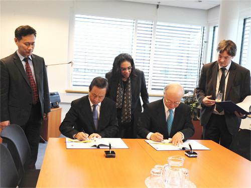 国家原子能机构主任许达哲(左二)与国际原子能机构总干事天野之弥(右二)签署协议。