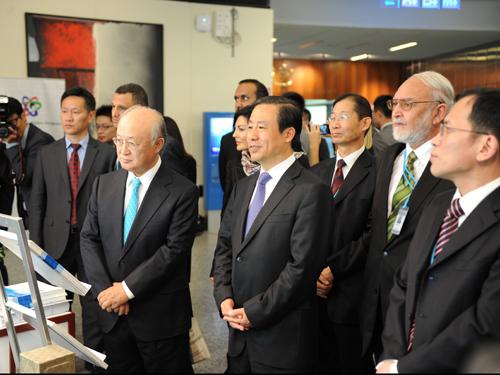 在国家原子能机构主任许达哲(前右二)的陪同下,国际原子能机构总干事天野之弥(前左一)参观中国代表团展区。