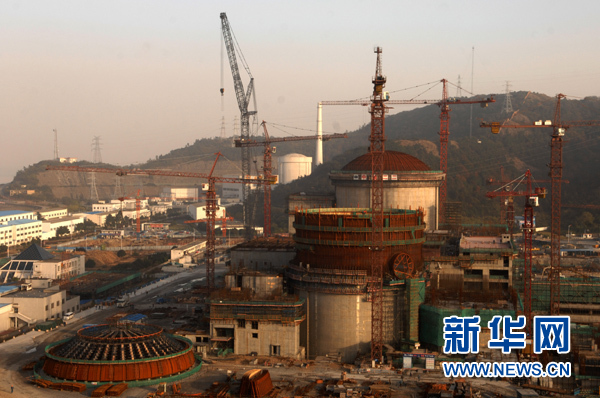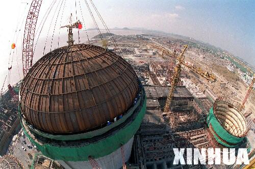 正在施工中的方家山核电工程的两座核岛。后方白色建筑即为1994年投入商业运行的我国首座国产核电站秦山核电站一期工程(12月3日摄)。