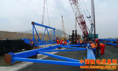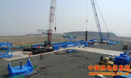 2009年4月4日18:15,由三门核电自主采购的LTL-2600B大吊车最后一个部件履带板在组装场地指定位置安全卸货。至此,大吊车全部组件17个陆运集装箱和83件海运大件已全部运抵现场,大吊车现场组装工作也将全面开工。