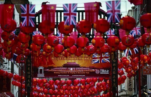 当地时间10月19日,英国伦敦,唐人街挂起中国国旗和红灯笼欢迎习近平到访。