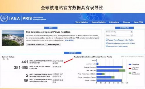 美国从1996年就没有新建机组,机组数量保持稳定。欧盟有一些新建的机组,但数量非常小,同期关闭的机组却是非常多的。国际上的数据有一个问题,很多的数据来源都是国际原子能机构,他们有一个反应堆信息体系,是一个公开的信息库。其中说到现在运行的反应堆有441个,这意味着什么?正在运行的反应堆,就是在运行在发电,如果说看各个国家的网页,也是同样一个数据库。大家可以看到在日本有43个反应堆是在运行中的,但是,在2014年日本这43个在运行的反应堆发电量是0,这就是一个问题。