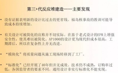 再说AP1000,它更有模块化的特点,所以被认为更简单,建造起来更快。成本更低。事实上,在AP1000的建设上,中国的实际情况是比EPR的工期还要滞后,美国AP1000设计的机组工期滞后的程度跟欧洲的EPR是一样的。比如说中国泰山项目,制造方会有一些问题,尤其是冷却泵,这应该是目前在中国泰山项目当中最严重的一个问题,导致严重的生产拖后。其中存在什么问题呢?无论如今看到的设计如何,没有任何证据表明新的设计更省钱,或者更容易建造。我们想一想,其实有很多反应堆的设计都是有了新的安全系统,如果你加了新的安全系统一定会更加复杂,也就是说你又带来了一个新可能,有可能失败的一个新风险,就是你把它安全系统做得越复杂就越难造。对于这样一个模块化的建设,大家以为它会变得更容易,使得我们解决很多问题,实际上从我们的分析来看,现在看到的就是有一些质量控制问题,从建设过程挪到了工厂。