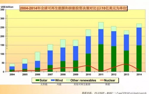 4、核电VS可再生能源核电在电力市场中的地位受威胁中国的核电相对可再生能源来说,它的投资2012年、2013年有所下降,在2014年的时候又反弹。最后再跟大家分享一下核电和可再生能源之间的一些比较。核电相对可再生能源来说,它的投资2012年、2013年有所下降,在2014年的时候又反弹几乎达到了2011年最高时候的水平。更有意思的是,在这3年当中价格却大幅度的下降了,就是你投入的资产可能是同样的,但是你能够购买的东西可能要更多了,价值大幅度下降了。