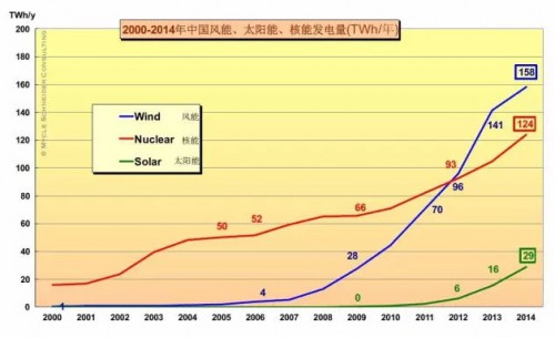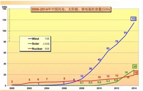 核电投资有上有下,有一些波动,这个波动主要是来自于中国,因为没有公开的一些数据,到底在核电方面有多少投资。可再生能源领域和核电领域的投资还是有很大的区别的,对于风电来说还有太阳能,装机容量大幅度的上升。这是以1997年京都议定书签署为基准的,当时都说核电是应对气侯变化一个非常重要的手段。看一下中国的发电量的情况,风电和光伏的增长都非常快。风电发电总量在2012年时候已经超过了核电,而光伏发电与风电、核电比起来相对还是比较低。