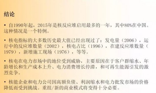 此外,具体到一个项目,HinkeyPnintC也有很多问题,目前还没有任何商业合同,但是也已经有了一个融资的机制,政府之间、行业之间已经签了一个融资的协议书,那么它有可能会带来一个潜在的商业合同。非常有意思的是中、英、法之间在10月份签了这个协议之后,投资银行给自己客户的建议是卖出他们持有法电的股份,因为他们认为是有风险的投资,法电的员工股东联合会把这个称作是一个可预见的金融灾难,他们要求法电的管理层要从这个项目退出来,这是前所未见的。
