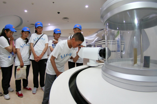 8月7日,来自西藏聂拉木县的藏族学生在山东核电科技馆观看核岛机组模型。新华社发(唐克 摄)