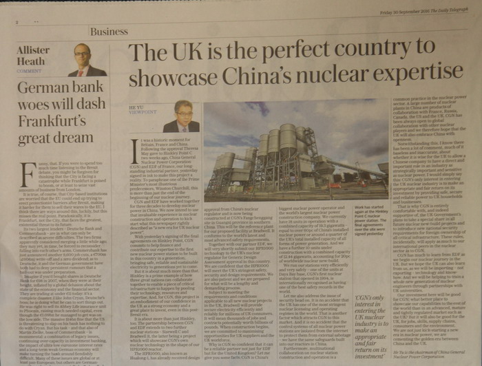 9月30日,在中广核与EDF及英国政府签署英国核电项目一揽子协议的次日,中国广核集团董事长贺禹在英国颇具影响力的《每日电讯报》上发表署名文章,现全文翻译转载如下: