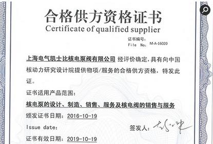 SEC-KSB被中国核动力研究设计院授予合格供方资格证书