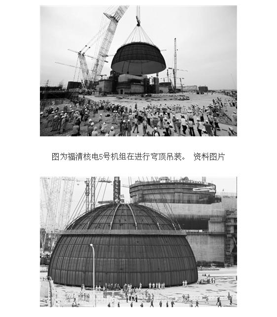 近日,伴随着汽笛声响,重约340吨的穹顶精准地落在45米高的核反应堆厂房顶部。穹顶吊装的成功,标志着我国自主研发的三代核电技术“华龙一号”全球首台机组福清核电5号机组经过两年建设,成功封顶。