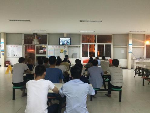 7月23日晚,中核五公司三门总承包部各党支部党员、入党积极分子及中层领导在健跳员工食堂观看大型政论专题片《将改革进行到底》第七集——强军之路。