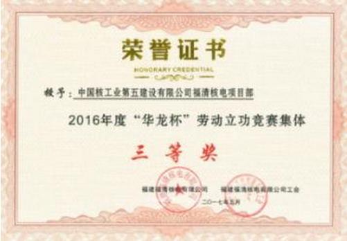 中核五公司福清核电项目部喜获福清业主公司2016年度“华龙杯”劳动立功竞赛表彰