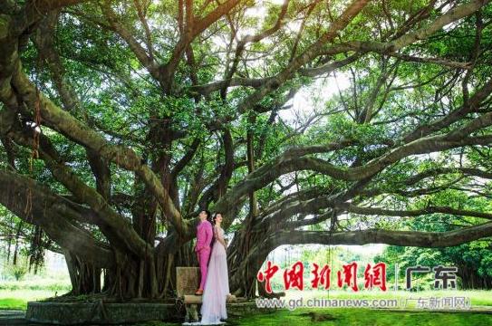 以大榕树为背景拍摄婚纱照