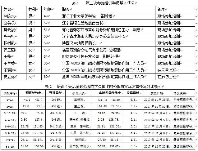 2017年11月21日—25日在西安中煤科工集团西安研究院对7名平均年龄在49.7岁来自不同职业的大龄学员进行了24小时临震预报培训,其后主要学习如何做全球范围内1-3个月的短期预报。经过4天培训后,这些学员就做出2017年12月—2018年2月的短期预报。到2017年12月26日,在预报的地区中已经有8个地区发震。下面的表1是此次参加培训的学员基本情况。表2是预报验证对比表。