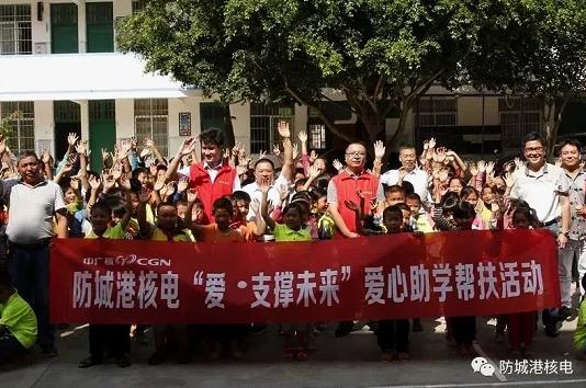 防城港核电认真履行社会责任,坚持在防城港市及厂址周边开展校企共建、爱心助学、慰问特殊群体、帮扶群众就业等社会公益活动。2017年,防城港核电承接中国广核集团在百色乐业县、凌云县的相关定点扶贫工作。选派员工担任凌云县加尤镇陇槐村第一书记,投入近500万元帮扶当地建立脱贫产业,组建了“中广核-凌云县特少数民族白鹭班”,资助350名凌云学子,并建立了“白鹭梦想书屋”,设立了“华龙”专项奖助学金。连续5年累计投入30多万元定点帮扶乐业县花坪镇运赖村9名贫困学生。防城港核电助力定点扶贫县产业、教育等事业实现大发展,助推当地精准脱贫。