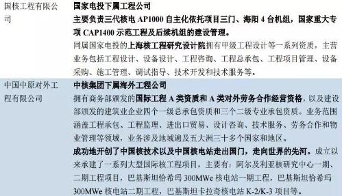 目前国内仅有三家具有核电工程总承包资质的工程公司,分别是中核集团下属的中国核电工程有限公司,中广核电力(1816.HK)下属的中广核工程有限公司,国家电投下属的国核工程有限公司。中核集团下属的中国中原对外工程有限公司主要负责海外核电项目工程。