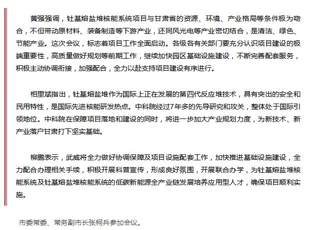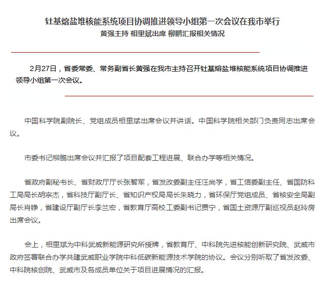 据武威日报报道,2月27日,甘肃省委常委、常务副省长黄强主持召开钍基熔盐堆核能系统项目协调推进领导小组第一次会议。